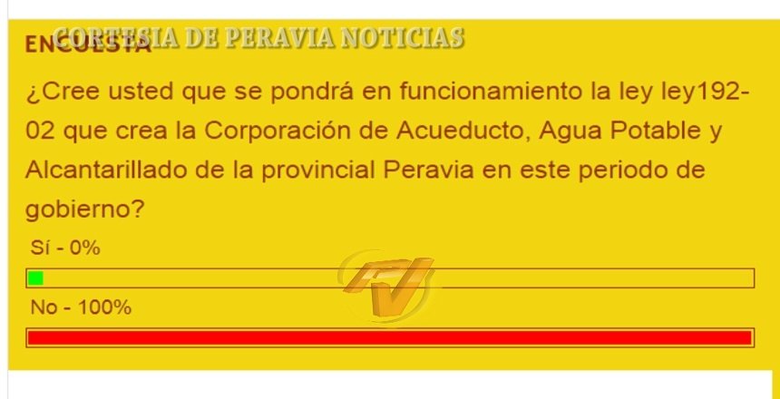 En la encuesta que desarrollamos semanalmente a través de la página web www.peraviavision.tv, se indagó sobre lo siguiente ¿Cree usted que se pondrá en funcionamiento la ley192-02 que crea la Corporación de Acueducto, Agua Potable y Alcantarillado de la provincial Peravia en este periodo de gobierno?