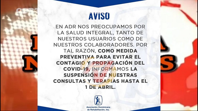 La información fue ofrecida a través de una comunicación colgada en las redes sociales, donde el presidente del consejo de gestión de la Asociación Dominicana De Rehabilitación filial Baní, Félix Peguero,expone que están suspendidas las consultas y terapias hasta el día primero de abril