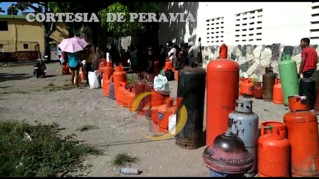 Desde temprana horas de la mañana una larga fila de cilindros de gas se observó en un solar al lado del Liceo Lucila Mojica en espera de la distribución.