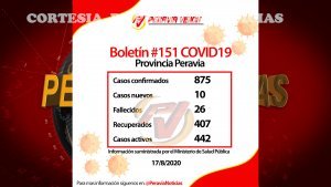 La Provincia Peravia reportó 10 de casos nuevos de coronavirus, para un aumento de 875 casos y 26 fallecidos acumulados.
