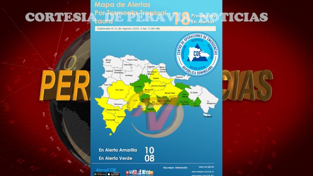 El Centro de Operaciones de Emergencias (COE) informó hoy que se mantienen diez provincias en alerta amarilla y ocho en Verde, por posibles inundaciones repentinas urbanas y rurales, crecidas de ríos, arroyos y cañadas tras el paso de la tormenta Laura por el país.