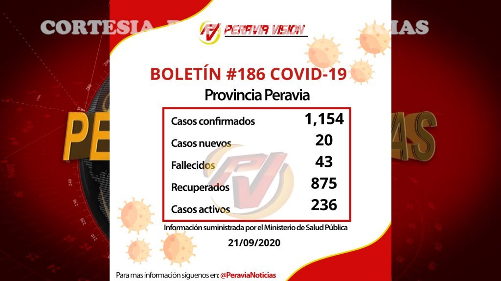 Para la provincia Peravia se reportaron 20 casos nuevos, aumentando a 1,154 el número de casos confirmados, 43 defunciones acumuladas y 875 personas recuperadas, por lo que el número de pacientes activos con el virus en la provincia es 236.