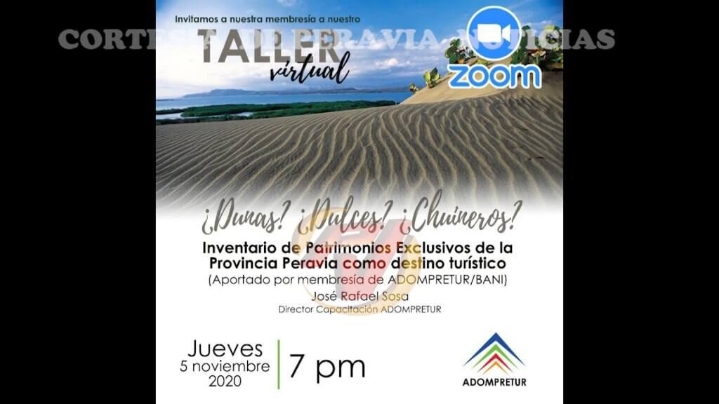 Adompretur Peravia, invita a todos los interesados en aportar al desarrollo de la provincia, para que este jueves, desde las 7 de la noche, se unan a través de la plataforma Zoom, para realizar el Inventario de Patrimonios Exclusivos de la Provincia Peravia como destino turístico, el cual contará con la participación del periodista José Rafael Sosa, Director Nacional de Capacitación de Adompretur.