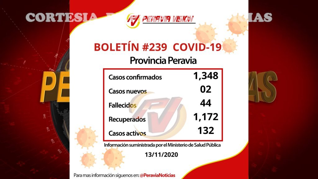 Para la provincia Peravia, se reportaron 02 casos nuevos en el día de hoy, aumentando a 1,348 el número de casos confirmados, 44 el número de defunciones acumuladas y 1,172 personas recuperadas, por lo que el número de pacientes activos con el virus en la provincia es de 132 personas.