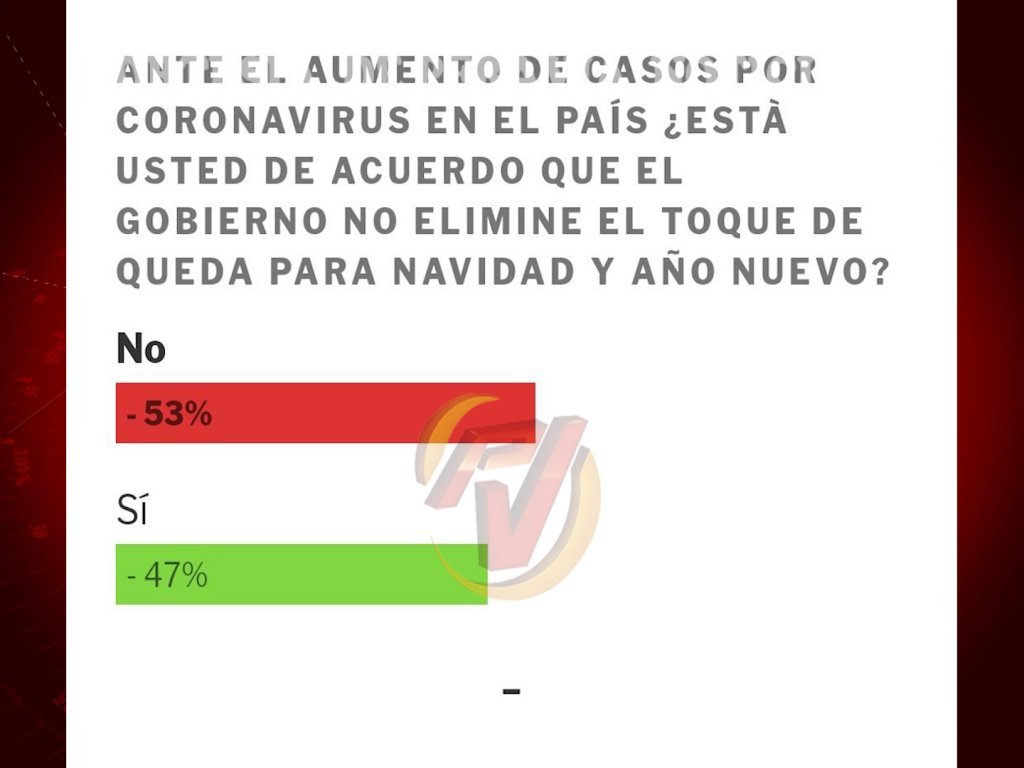 En ese sentido, los votantes, representados en un 47 por ciento, afirmó que sí, mientras que un 53 por ciento dijo que no consideraba que el toque de queda sea eliminado para navidad y año nuevo.