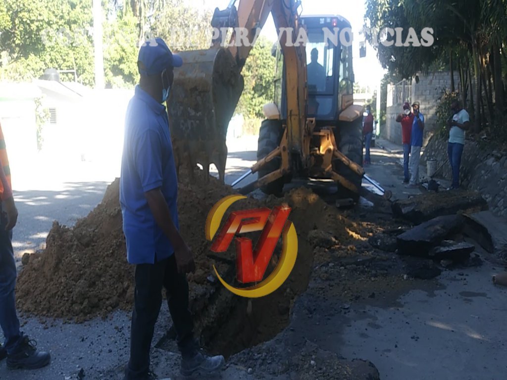 Una retro excavadora alquilada por la Junta Distrital abrió la zanja marcada por los obreros de Inapa de Baní y Santana quienes trabajan en conjunto para sellar la rotura del tubo de 12 de impulsión que distribuye el agua en el distrito Municipal.