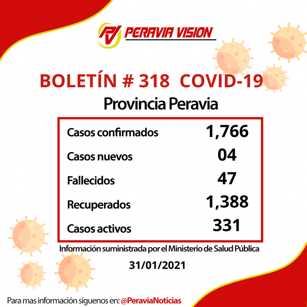 En la provincia Peravia, en el informe se destaca que existen 1, 766 casos confirmados a nivel local, de los cuales, 1,3888 se han recuperados y 331 continúan activos.