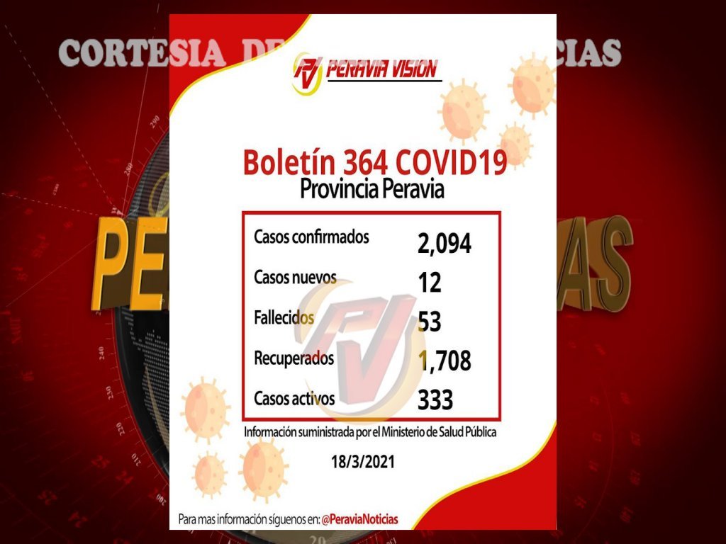 Se reporta 12 casos nuevos de coronavirus para la Provincia Peravia, según el boletín presentado por Salud Publica de manera diaria.