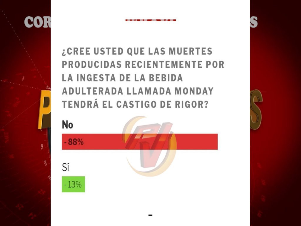 La semana pasada, los usuarios de www.peraviavision.tv tuvieron la oportunidad de expresarse si creían que las muertes producidas recientemente por la ingesta de la bebida adulterada llamada Monday tendrá el castigo de rigor.