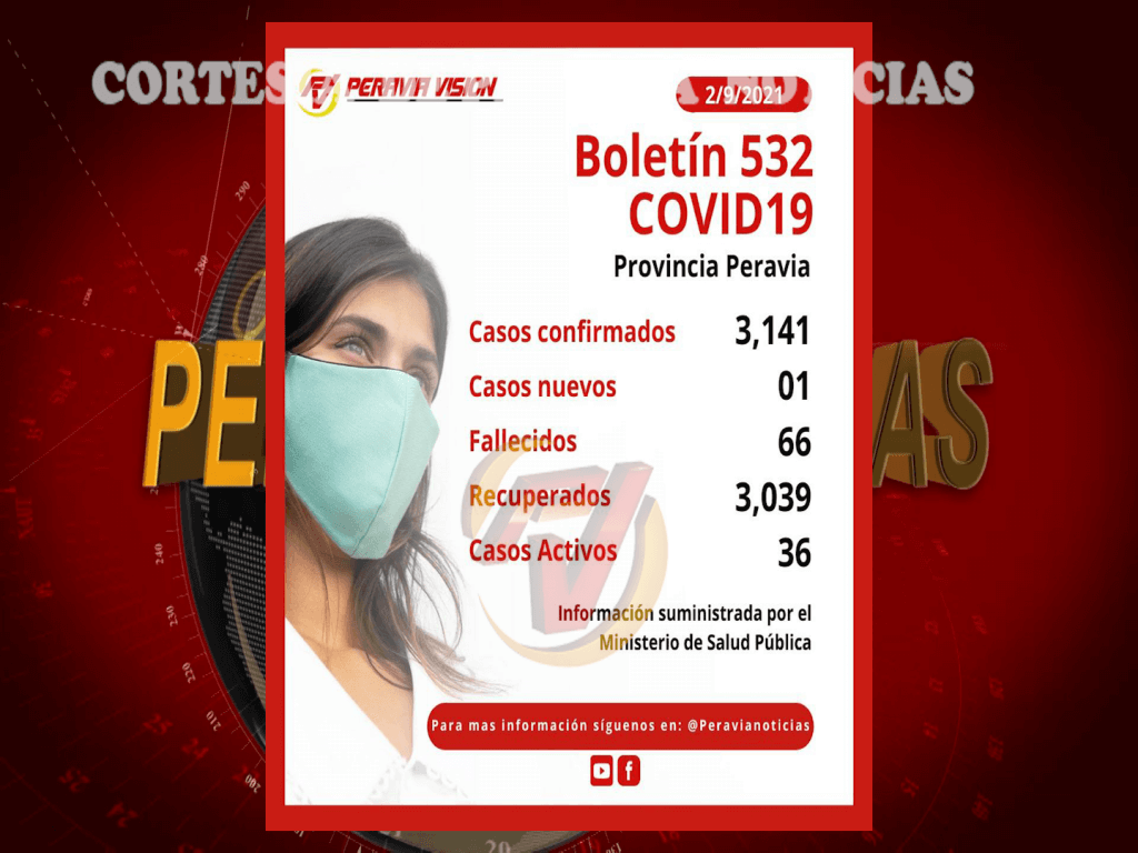 Peravia, RD.- El ministerio de salud pública  reportó 01 caso nuevo para la provincia Peravia, por lo que el acumulado se sitúa en  3,141 y  66 defunciones, según los datos emitidos en el boletín # 532.