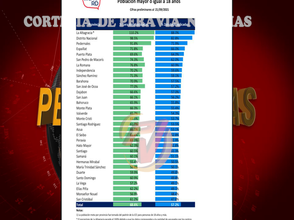En cuanto al boletín anterior de fecha 13 de septiembre del año en curso, de la primera dosis, Peravia reportó un 62.2% de la primera y un 51.1% de la segunda.