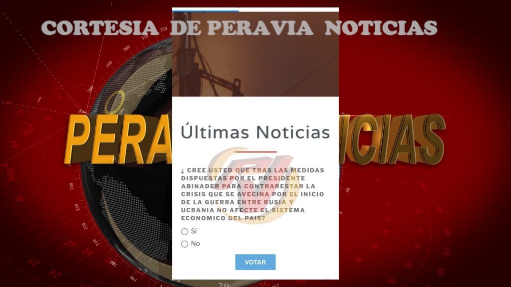 En ese sentido, la encuesta para esta semana que tendremos a disposición de nuestros usuarios en www.peraviavision.tv es: ¿Cree usted que tras las medidas dispuestas por el presidente Abinader para contrarrestar la crisis que se avecina por el inicio de la guerra entre Rusia y Ucrania no afecte el sistema económico del país?