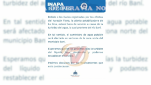 Peravia, R.D. El Instituto Nacional de Aguas Potables y Alcantarillados anunció que la planta potabilizadora La Gina estará fuera de servicio, lo que afectará a sectores de la zona norte.