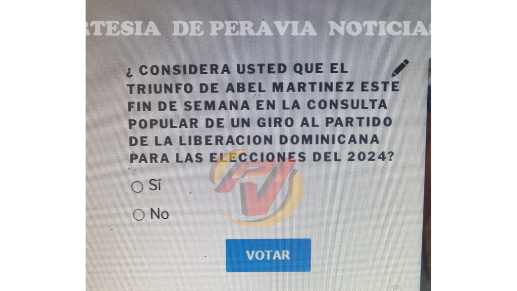 Por tal razón, la encuesta para esta semana que tendremos a disposición de nuestros usuarios en www.peraviavision.tv es: ¿Considera usted que el triunfo de Abel Martínez este fin de semana en la consulta popular de un giro al Partido de la Liberación Dominicana para las elecciones del 2024?