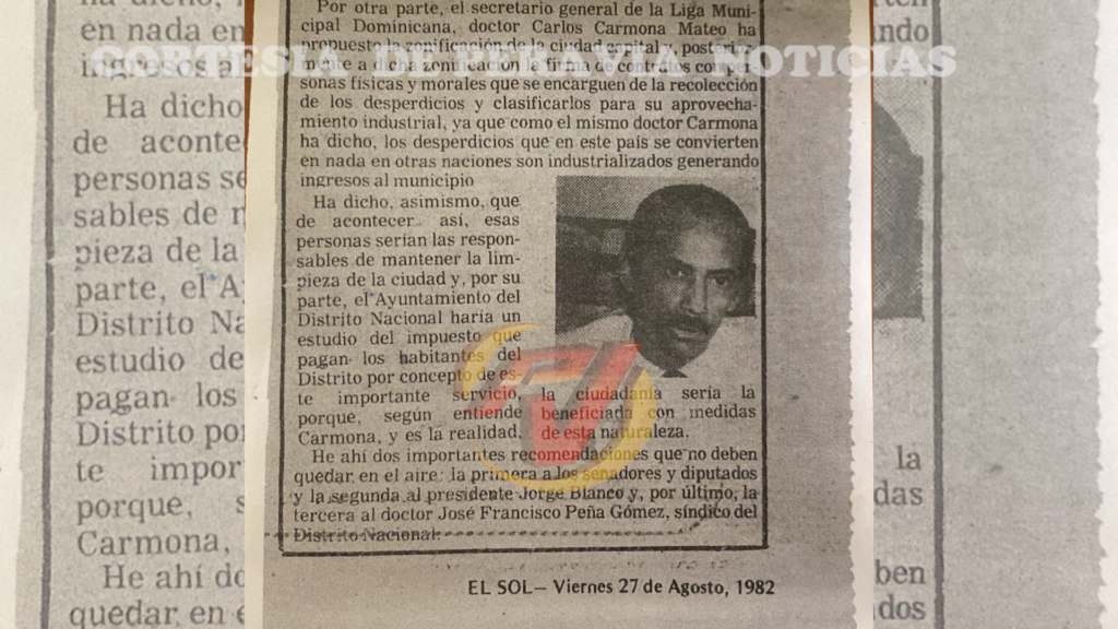 Para la aclaración de este hecho, el doctor Carlos Carmona Mateo entregó copias sobre la publicación realizada por el diario El Sol, con fecha Viernes 27 de agosto del año 1982, el que especifica que “El secretario general de la Liga Municipal Dominicana, Carlos Carmona Mateo, ha propuesto la zonificación de la ciudad capital y, posteriormente a dicha zonificación la firma de contratos con personas físicas y morales que se encarguen de la recolección de desperdicios y clasificarlos para su aprovechamiento industrial, ya que como el mismo doctor Carmona ha dicho, los desperdicios que en este país se convierten en nada en otras naciones son industrializados generando ingresos al municipio”.
