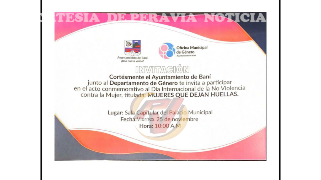 El departamento de Género del Ayuntamiento Municipal de Baní informó sobre una actividad a efectuarse mañana viernes 25, en el marco del Día Internacional de la no violencia contra la mujer.