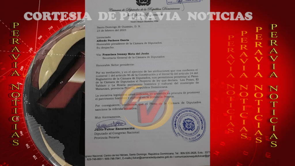 El diputado por la provincia Peravia, Julito Fulcar, sometió ante la cámara de diputados el proyecto de ley que busca sea declarado Las Pozas, El Tablazo y La Rosita como patrimonio histórico del municipio Matanzas.