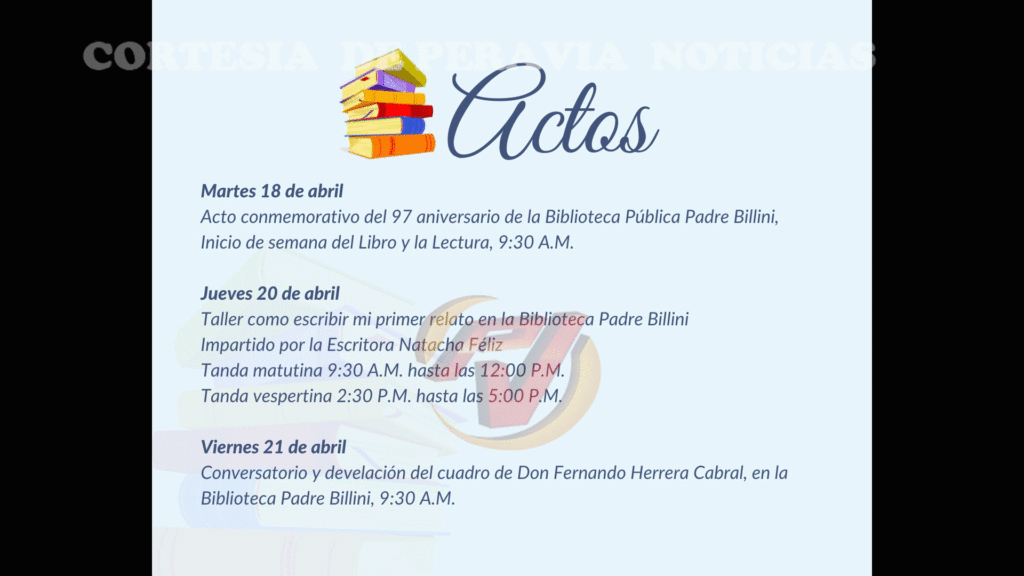Según la agenda de los actos a realizar, enviada desde el departamento de cultura del ayuntamiento de Baní, el próximo martes 18 de abril se realizará el acto conmemorativo del 97 aniversario de la Biblioteca Publica Padre Billini, inicio de semana del Libro y la Lectura a las 9:30 de la mañana.