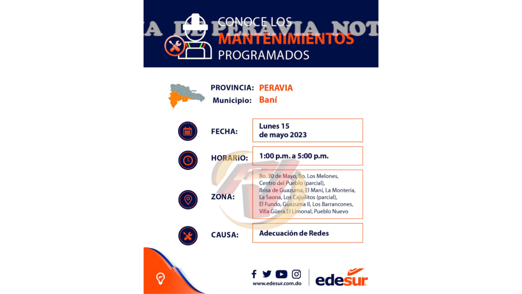 Según el informe de la empresa distribuidora de energía del sur, los sectores que no contaran con el servicio eléctrico desde la 1 hasta las 5 de la tarde en el municipio Baní debido a trabajos de adecuaciones de redes son, el centro del pueblo parcialmente, Brisa de Guazuma, El Maní, La Montería, La Saona, Los Cajuilitos Parcialmente, El Fundo, Guazuma II, Los Barracones, Villa Güera, El Limonar, Pueblo Nuevo, 30 de Mayo y Los Melones.