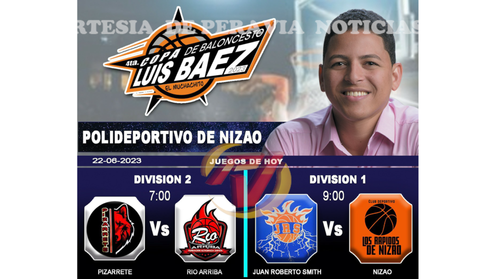 Esta noche, la 4ta. Copa de Baloncesto Luis Báez, El Muchachito, se traslada al Polideportivo de Nizao donde jugarán Pizarrete vs Río Arriba y Juan Roberto Smith vs Nizao.