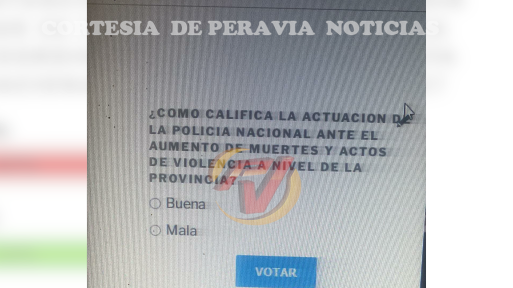 Por tal razón, la pregunta que tenemos a disposición de los usuarios de Peravia Noticias a través de www.peraviavision.tv es ¿Cómo califica la actuación de la Policía Nacional ante el aumento de muertes y actos de violencia en Peravia? Le invitamos a que se haga partícipe de la misma.