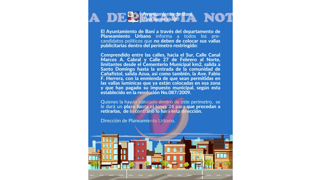 El ayuntamiento de Baní a través del departamento de Planeamiento urbano hizo un llamado a los precandidatos políticos sobre la colocación de vallas publicitarias en zonas restringidas.