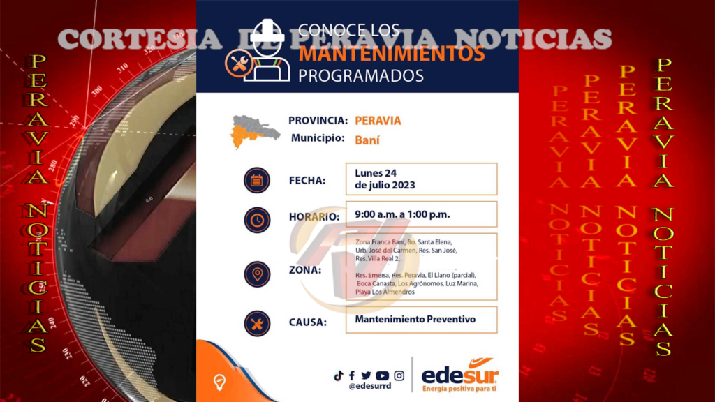 Este lunes continúan las suspensiones eléctricas en el municipio banilejo como consecuencia de los mantenimientos preventivos que realiza EDESUR Dominicana.