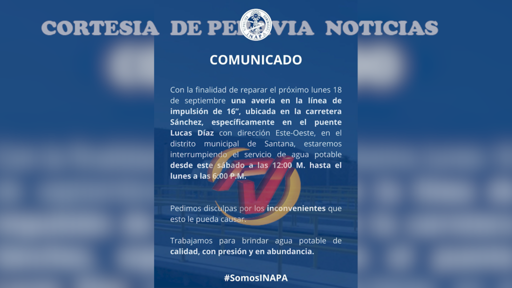 A través de un comunicado, el Instituto Nacional de Aguas Potables y Alcantarillados informa sobre la interrupción que estará registrando el servicio de agua debido a la reparación de una avería en el distrito municipal Santana.