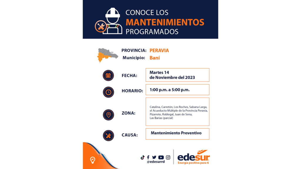 La empresa distribuidora de Energía del Sur, Edesur, informó sobre la suspensión de la energía eléctrica por alegados mantenimientos preventivos.