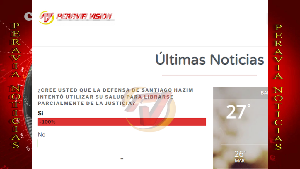 De acuerdo con los resultados publicados en el portal WWW.PERAVIAVISION.TV, el cien por ciento de los usuarios que participaron en la encuesta semanal considera que la defensa del exdirector de Senasa, Santiago Hazim, habrรญa intentado utilizar su situaciรณn de salud como un recurso para evadir parcialmente la acciรณn de la justicia.