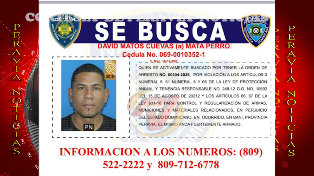 David Matos Cuevas, alias โMata Perroโ, es acusado de aparecer en un video que circula en redes sociales utilizando un rifle para ejecutar un perro en una finca ubicada en Banรญ, provincia Peravia.