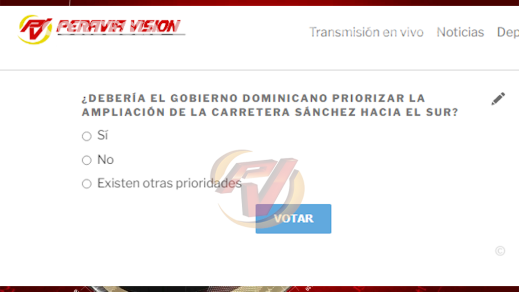 En este contexto, la encuesta que tenemos a disposiciรณn de nuestros usuarios a travรฉs de WWW.PERAVIAVISION.TV es ยฟDeberรญa el gobierno dominicano priorizar la ampliaciรณn de la carretera Sรกnchez hacia el sur?